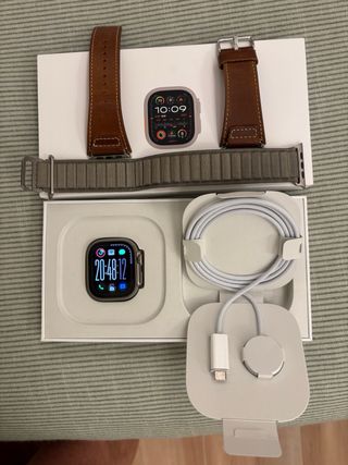 Apple Watch Ultra 2 – 49 mm titanio Vendo mi Apple Watch Ultra 2 (49 mm, titanio), comprado el 25/09/2023, con factura original y en estado impecable, sin golpes ni arañazos. La salud de batería es del 98 %. Además, incluyo dos correas: la original y una correa adicional de acero. Incluye cargador y caja original.