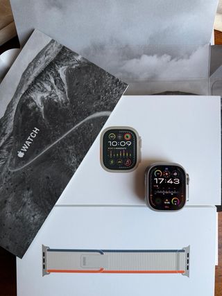 Reloj inteligente Apple Watch Ultra 2 en acabado Titanio Natural. Diseñado para la salud y el rendimiento. *Disponible pack con los AirPods Pro 2 ( en venta en otro anuncio por 150€) por 700€ - Caja de titanio. - Pantalla siempre activa. - Resistencia al agua. Salud Batería 87% No presenta ningún tipo de golpe ni arañazo el chasis del reloj Correa usada de 2 años con el velcro desgastado. Cable para cargar incluido Caja original completa tanto del reloj como de la correa