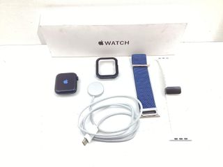 Reloj inteligente Apple Watch Series 4 en color plata y negro. Incluye su caja original y accesorios. - Correa negra. - Cable de carga.
