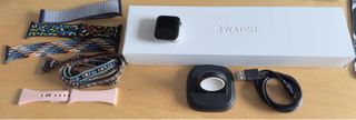 Se vende Apple Watch Series 6 de 40 mm en aluminio, con conectividad GPS y Cellular. Incluye varios accesorios. - Correa de silicona rosa. - Correa tejida con diseño geométrico. - Correa con estampado de confeti. - Correa de tela gris azulado - Pulsera estilo 'boho' con cuentas. - Base de carga. - Cable de carga USB.