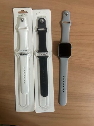 Reloj Apple Watch Series 6 en color gris, acompañado de dos correas adicionales. Sin caja - Reloj Apple Watch gris. - Correa blanca. - Correa negra. -Con su Cable de carga USB.