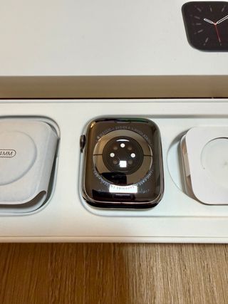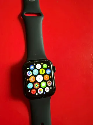 Reloj inteligente Apple Watch en color negro espacial de 44 mm series 5 Von caja y cargador originales, con 12 fundas y protector de pantalla y un cargador inalámbrico. La pantalla tiene dos arañazos visibles por lo demás está bien cuidado.