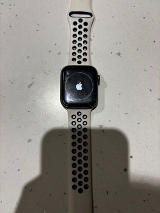 Apple Watch Series 5 Nike con conectividad LTE. Este modelo puede hacer llamadas y mandar mensajes sin necesidad de teléfono. -Bateria muy bien cuidada , porque solo lo he usado temporadas en verano y no lo dejo encendido conectado a la base. - Caja de aluminio en color gris. - Correa deportiva Nike en color negro con perforaciones. - Pantalla Retina. - Resistencia al agua incluyo cargador original y todo tipo de correas. +3 fundas TAMAÑO 44