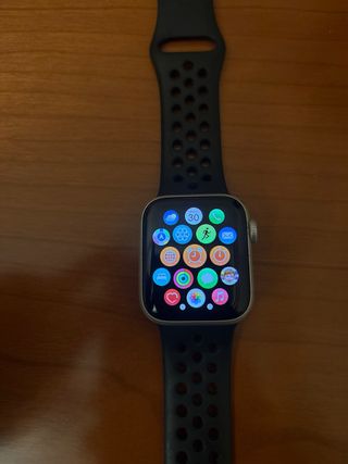 Reloj inteligente Apple Watch SE Nike con acabado plateado y correa negra. - Diseño deportivo con perforaciones en la correa. - Pantalla nítida y brillante. - Precio negociable. - Se entrega en caja original - Pantalla 40mm.