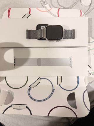 vendo apple wacht serie 7 de 45 mm acero inoxidable,salud de bateria 98%. - Caja de plata. - Correa de silicona beige.