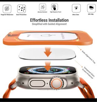 Kit de instalación para Apple Watch Ultra. - Incluye 2 protectores de pantalla de vidrio templado. - Incluye 2 toallitas húmedas (Wet Wipes). - Incluye 2 toallitas secas (Dry Wipes). - Incluye pegatinas para eliminar el polvo (Dust-absorber). - Incluye guías de instalación (Guide Sticker).