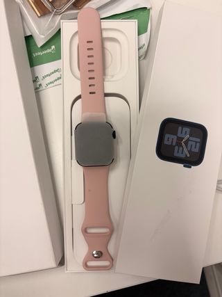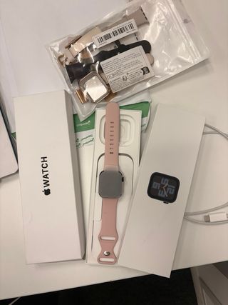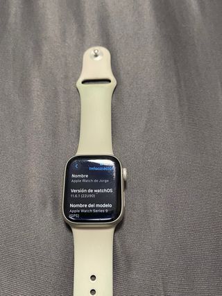 Reloj inteligente Apple Watch Series 9 GPS en color beige.94 % de batería,libre de ,pequeños arañazos en la pantalla,mirar foto 8 ,9,solo reloj y cargador y correa metálica - Caja de aluminio. - Correa deportiva. - Pantalla Retina. - Resistencia al agua.