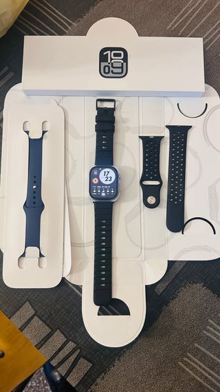 Reloj inteligente Apple Watch Series 10 de 46mm en color negro y gris espacial. - Caja de aluminio. - Correa deportiva negra. - Incluye dos correas adicionales.