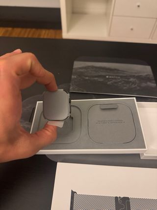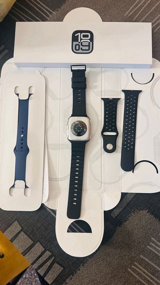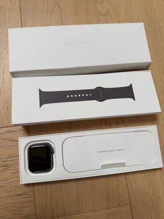 Reloj inteligente Apple Watch Series 10 en color plata, con caja y accesorios. Comprado en Fnac, incluyo factura. Muy poco uso. 99% de salud de batería. Lo vendo porque me han regalado un modelo superior. - Tamaño de caja de 42mm. - Incluye cargador magnético, a estrenar. - Correa original deportiva de tejido gris. - Incluye correa plateada de eslabones - Incluye protector de pantalla a estrenar