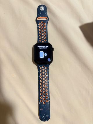 Apple Watch series 7 Nike en color plata, caja de 45mm y GPS. Marcas de uso en la pantalla (se aprecia en fotos). Salud de la batería 83%. Se entrega con caja y cargador originales.
