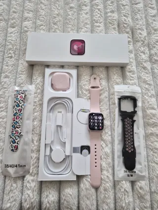 Reloj inteligente Apple Watch Series 9 GPS 41mm en color rosa. Incluye varios accesorios. Cargador nuevo a estrenar. Reloj impecable poco uso.. - Correa de silicona rosa. - Correa con estampado multicolor. - Correa deportiva negra. - Cargador magnético. - Caja original