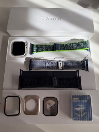 Se vende Apple Watch Series 9 de 45mm junto con varios accesorios. - Correa deportiva multicolor. - Correa deportiva gris. - Correa deportiva azul oscura NIKE. - Protector de pantalla. - Funda protectora para el reloj. Funciona a la perfección impoluto.