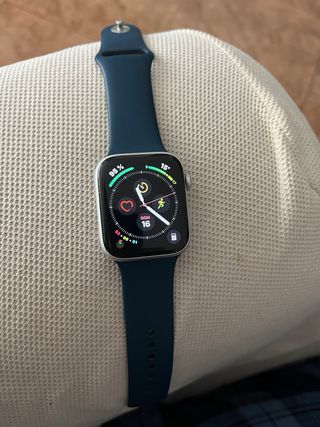 Reloj inteligente Apple Watch con correa azul marino y detalles plateados. Apple Watch Se(GPS). Caja de aluminio en plata de 44mm Año compra 2022 66% salud bateria incluido : Caja original con todo :cargador (prácticamente nuevo ), pulsera agujeros azul sin estrenar (llevaba la caja 2 ) Regalo : correa en inox muy chula para ocasiones . Merece la pena , lo vendo por que me han regalado otro Watch.