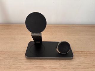 Estación de carga 3 en 1 de la marca Compact Design, compatible con iPhone, Apple Watch y AirPods. Ideal para tener la mesita de noche o el escritorio ordenados: carga los tres dispositivos a la vez y sin cables sueltos. Está en muy buen estado, cuidada y funcionando perfectamente. Incluye su caja original, tal como aparece en las fotos. Características: • Carga inalámbrica rápida hasta 15W • Sistema magnético para iPhone compatible con MagSafe • Soporte ajustable en ángulo para ver la pantalla mientras carga • Plegable, ligera y perfecta para viajes • Zona dedicada para Apple Watch • Base específica para AirPods / AirPods P
