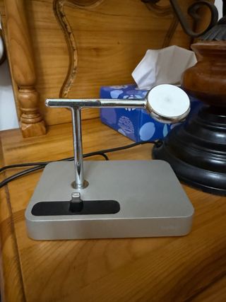 Base de carga Belkin para iPhone y Apple Watch. Diseño moderno y funcional. - Conector Lightning integrado para iPhone. - Soporte para carga inalámbrica de Apple Watch. - Acabado metálico plateado.