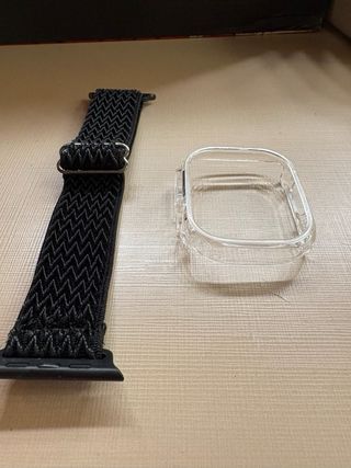 Conjunto de correa y funda protectora para Apple Watch Ultra 2 de 49mm. - Correa elástica negra con patrón de zigzag. - Funda protectora transparente.