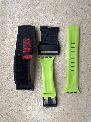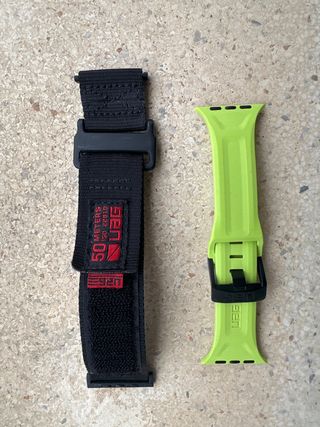 Dos correas de repuesto para Apple Watch de la marca UAG. - Correa negra de nylon con cierre de velcro y hebilla. - Correa verde lima de silicona con cierre de hebilla.
