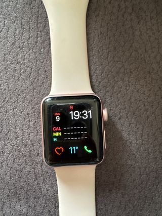 Reloj inteligente Apple Watch Series 2 en color rosa oro. - Tamaño de caja de 38mm. - Correa de silicona rosa M/L. - Muy cuidado y funciona perfectamente. La batería le dura entre 1 y 2 días dependiendo del uso.