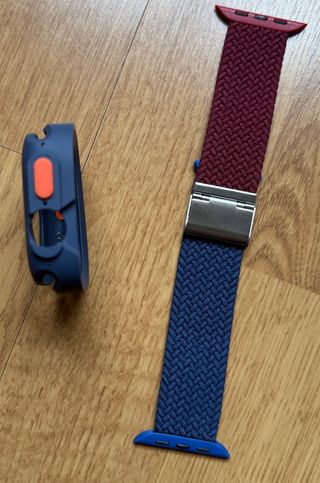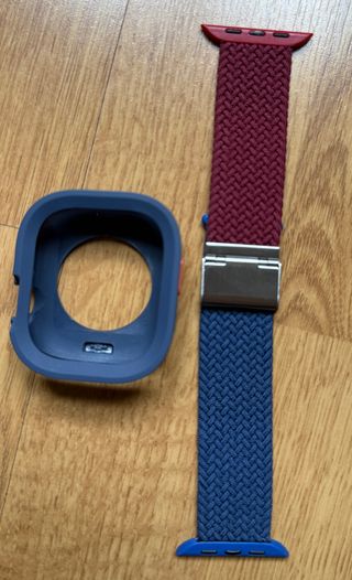 Conjunto de correa y funda protectora para Apple Watch. - Correa elástica trenzada en dos tonos: burdeos y azul. - Hebilla metálica. - Funda protectora azul para el reloj. En la tercera imagen se muestra todas las correas que tengo a la venta, por si te gusta otra.