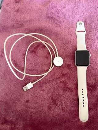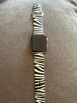 Apple Watch Series 3 de 42 mm con una llamativa correa con estampado de cebra. - Caja de color oro. - Correa multicolor con diseño de cebra y más correas originales de . - Se vende con su cable original. -Salud de la batería 92% se vende por no ser compatible con el iPhone 16 pro Max