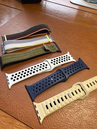 Lote de correas para Apple Watch de 42mm a 46mm. Incluye varios estilos y colores para personalizar tu reloj. - Correa de tela multicolor (verde, burdeos, naranja). - Correa de tela bicolor (gris, amarillo). - Correa de tela verde militar. - Correa deportiva blanca con perforaciones. - Correa deportiva azul marino con perforaciones. - Correa beige con diseño acanalado y cierre de hebilla.