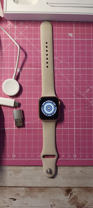 SmartWatch Apple SE, GPS , 40 mm, Caja de aluminio en oro. Correa rosa arena. Embalaje original con cable de carga y un adaptador para puerto USB comprado a parte y correa extra a estrenar. Usado 2 veces.No confundir con el modelo Serie 5 (mas antiguo) Pantalla de Retina. Resiste el agua hasta 50 metros.Entrenamientos.Altímetro.Música, podcasts y audiolibros.Frecuencia cardíaca. Control ciclo menstrual. Detección de caída fuerte y conexión con servicios de emergencia si estás inmóvil.También en el extranjero.Haz llamadas, responde correos, brújula y Maps. Siri integrado.Haz compras con Contactless,tarjetas de embarque o entrada de c