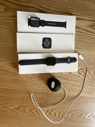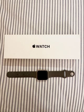 Reloj inteligente Apple Watch en color negro y gris espacial. Incluye cargador. Se vende por falta de uso, se lo regale a mi hermano y se lo ha puesto 2 veces. Si necesitais mas informacion no dudeis en preguntarme, gracias. - Correa de silicona. - Protector de pantalla. - Base de carga.