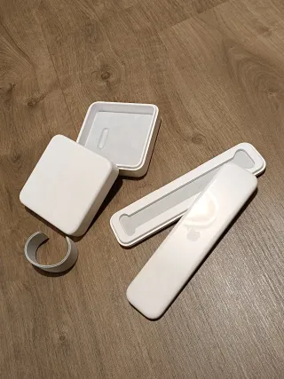 Conjunto de cajas vacías de smartwatch la marca Apple watch (las originales de plástico, no son de cartón) una es la caja de reloj y la otra la caja de la correa. - Cajas de almacenamiento. - Diseño blanco minimalista.