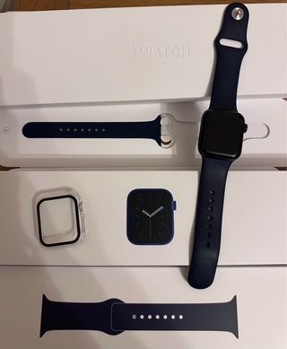 Reloj inteligente Apple Watch con correa de color azul marino y pantalla protectora negra. - Pantalla táctil de 44mm. - Correa de silicona. - Cierre de hebilla. - Tiene tres semanas de uso - Cargador incluido - Cajas originales incluidas - Sumergible - Carcasa protectora incluida