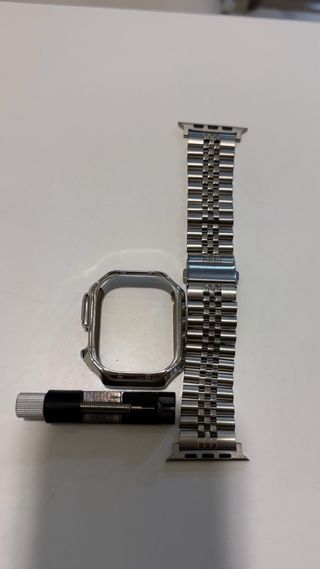 Conjunto de correa de metal plateada y protector para Apple Watch. Incluye herramienta para ajustar la correa. - Correa de eslabones de metal. - Protector de caja metálico.
