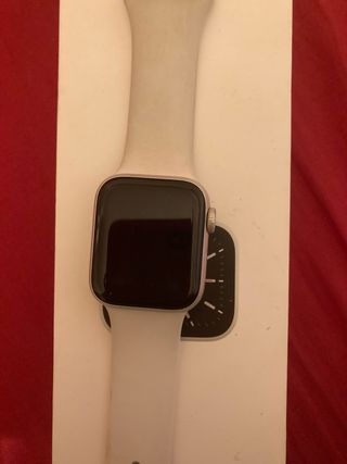 Reloj inteligente Apple Watch Serie 5 44mm en acabado negro y plateado con correa blanca. Incluye su caja original y cable cargador magnético. Usado muy poco. Tiene un pequeño toque en una esquina como muestra la ultima foto, pero es inapreciable.