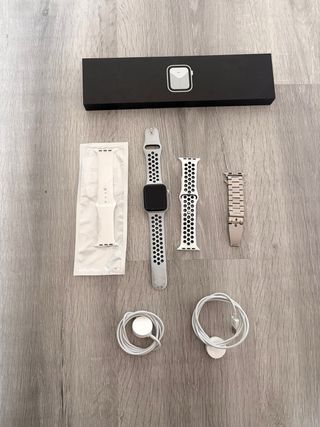 Reloj inteligente Apple Watch Nike Series 6. Lo vendo con todas las correas y los dos cables de carga. También incluye la caja original. - Caja de aluminio gris. - Correa deportiva Nike de silicona blanca. - Correa metálica plateada. - Cable de carga USB-C - Cable de carga USB.