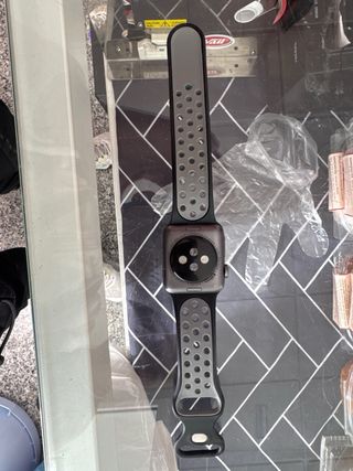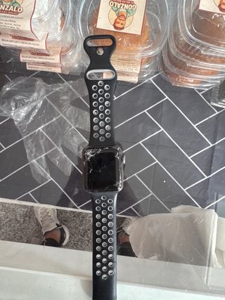 Reloj inteligente Apple Watch Serie 3 de 38 mm. La pantalla presenta grietas. - Correa deportiva negra con perforaciones. Otra correa de vestir nueva valorada en 10€ autentica Apple Watch - Caja de aluminio plateado su caja y cargador Por 20€ más reemplazas el cristal de pantalla y tiene un reloj que va fenómeno!! todas sus funciones las hace perfectamente , solo es el cristal que está partido lo demás va perfectamente funcionando NO NEGOCIABLE ! Si queréis que os muestre que está solo para enlazar hablarme al 618251817 que no está bloqueado ni nada y mando vídeos que haga falta !