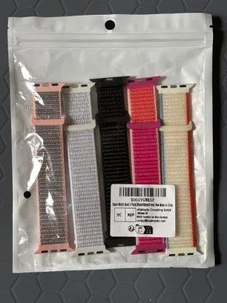 Lote de cinco pulseras elásticas para Apple Watch. Son compatibles con tamaños de 38mm, 40mm y 41mm. - Material textil tejido. - Cierre ajustable. - Colores variados: negro, beige con detalles de color, gris, rosa y fucsia.