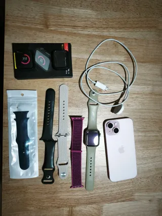 Se vende iPhone 15 junto con un Apple Watch y accesorios. - iPhone 15 en color rosa. - Apple Watch con correa verde. - Correa de Apple Watch negra. - Correa de Apple Watch gris. - Correa de Apple Watch morada. - Cable de carga USB-C. - Funda protectora para Apple Watch.