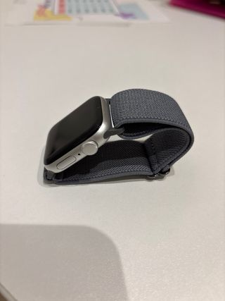 Vendo correa Apple watch de silicona blanda. Color azul marino, con agujeros tipo Nike sportband, sin estrenar. Ideal para nadar o correr ya que no se acumula el agua/sudor. Tamaño mediano como indicado en las fotos: 17cm por 3,5cm. Encaja perfectamente con el Apple watch de 45mm.