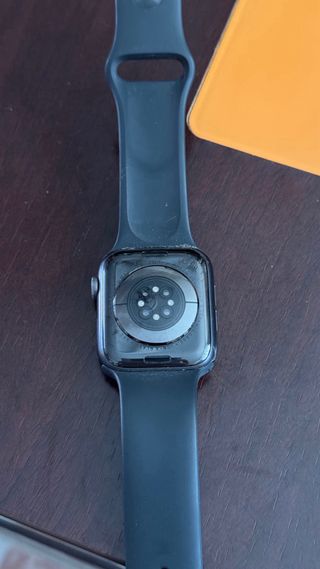 Vendo Apple Watch Serie 7 de 45mm en color negro espacial. El reloj presenta algunos pequeños arañazos en la pantalla, tal como se ve en las fotos. Se incluye el reloj, dos correas negras y las cajas originales. - Incluye dos correas de silicona negra. - Se entrega con cajas y cargador originales.