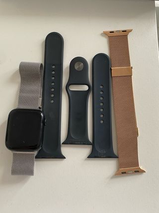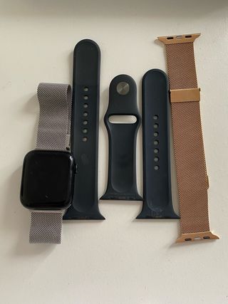 Incluye conjunto de correas para Apple Watch SE de 2ª generación.🍎 - Correa de malla en color dorado.🤎 - Correa de malla en color plata.🩶 - Correas deportivas de silicona en color azul marino.💙 -Incluye cargador🔌 Esta en perfecto estado y se compro nuevo.