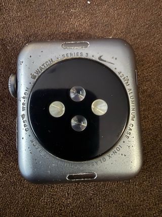 applewatch 3 42mm Nike. No se ve la pantalla, funciona Siri, registra entrenos, obedece el tactil, etc. Incluye todo lo de las fotos. Caja con una rayita casi inapreciable. cable de carga que le puse un refuerzo porque se empezaba a rajar la funda, pero carga bien. Protectores del applewatch. etc.