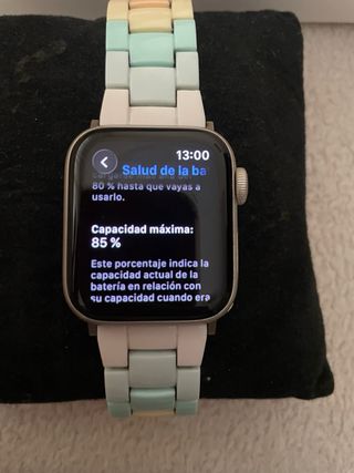 Apple Watch SE de segunda generación con caja de 40mm cuerpo color aluminio starlight. -Salud batería 85%. - Tiene marcas en la pantalla que no se aprecian en uso. Inclye: - Caja original. - Correa original como nueva, talla S/M. - Cable carga genérico. - Correa con eslabones en tonos pastel usada. - Correa milanesa en color oscuro sin apenas uso. - Correa con motivos disney sin apenas uso. - Correa trenzada azul usada. - Correa transparente sin apenas uso. - 2 protectores pantalla. - 2 protectores cuerpo.