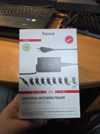 Adaptador de corriente universal Hama para portátiles. Está nuevo lo compré por error y tiré el tiquet. Incluye varios conectores para diferentes marcas. - Potencia de 65W. - Voltaje de entrada 100-240V. - Incluye 7 adaptadores de conector. - Compatible con marcas como Acer, Asus, Dell, HP, Lenovo, Samsung, Toshiba y más.