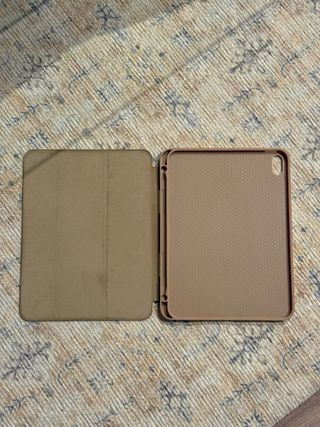 Funda protectora para iPad con un acabado dorado. - Diseño plegable con tres secciones. - Material resistente. - Almacenamiento para Apple Pencil
