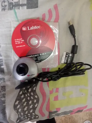 Webcam Labtec plateada y negra, incluye CD de instalación. - Webcam Labtec. - CD de instalación para Windows 98SE, Me, 2000, XP. - Cable USB.