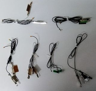 Distintas antenas Wi-Fi para ordenadores portátiles. Útiles para reparaciones o para instalar o actualizar tarjetas inalámbricas. La conexión a la tarjeta inalámbrica es mediante coaxial ultra miniatura Hirose U.FL. La longitud de cable es suficiente para cualquier portátil. Seis (6) unidades disponibles. Cinco (5) disponen de antena rígida y una (1) de antena flexible.