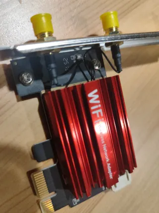Adaptador de red inalámbrico PCIe con un diseño moderno y eficiente. - Incluye dos antenas para una mejor recepción de señal. - Componente principal con disipador de calor rojo. - Se acompaña de un cable y un soporte de montaje.