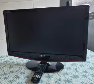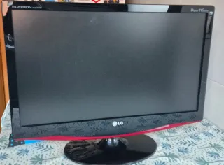 Monitor LG negro con detalle rojo. - Base abatible - 22" - Multiples conectores - Se incluye cable de alimentación - Mando a distancia En muy buen estado. El mando funciona perfectamente pero no cierra la tapa de las pilas. No sontoniza por antena canales TV en HD