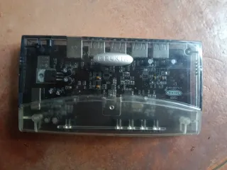 Hub USB de la marca Belkin con cuatro puertos. - Diseño compacto y transparente. - Ideal para expandir las conexiones de tu ordenador.