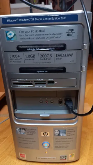 Ordenador clásico HP con sistema operativo Windows XP Media Center Edition 2005. Incluye unidad DVD-RW. -Teclado HP -Monitor Samsung 19" - Procesador 3700+ - Memoria RAM 1.0GB - Disco duro 200GB -Internet por ADSL -Raton con cable Windows XP -Documentacion original
