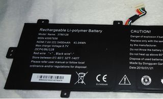 Batería recargable de polímero de litio para portátiles Medion Akoya. Para los modelos Medion Akoya: E4253 E3221 E3222 MD6245 MD63500 E3223 E4222 - Modelo: 3786128 - Voltaje nominal: 7.6V - Capacidad: 5400mAh / 41.04Wh - Voltaje máximo de carga: 8.7V - Cable rojo: +, Cable negro: - Envíos por Correos e InPost.