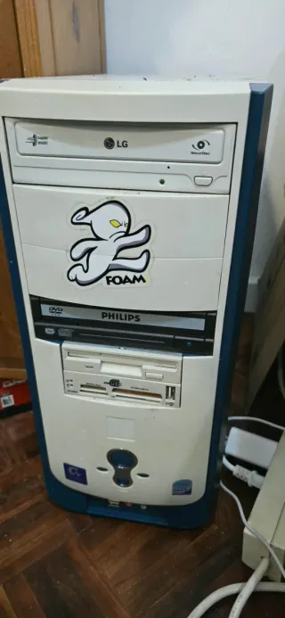 Torre de ordenador con un diseño bicolor. Funciona con cable de alimentación - Unidad óptica LG Super Multi. - Unidad óptica Philips DVD. - Lector de tarjetas integrado. - Frontal con detalles en azul.